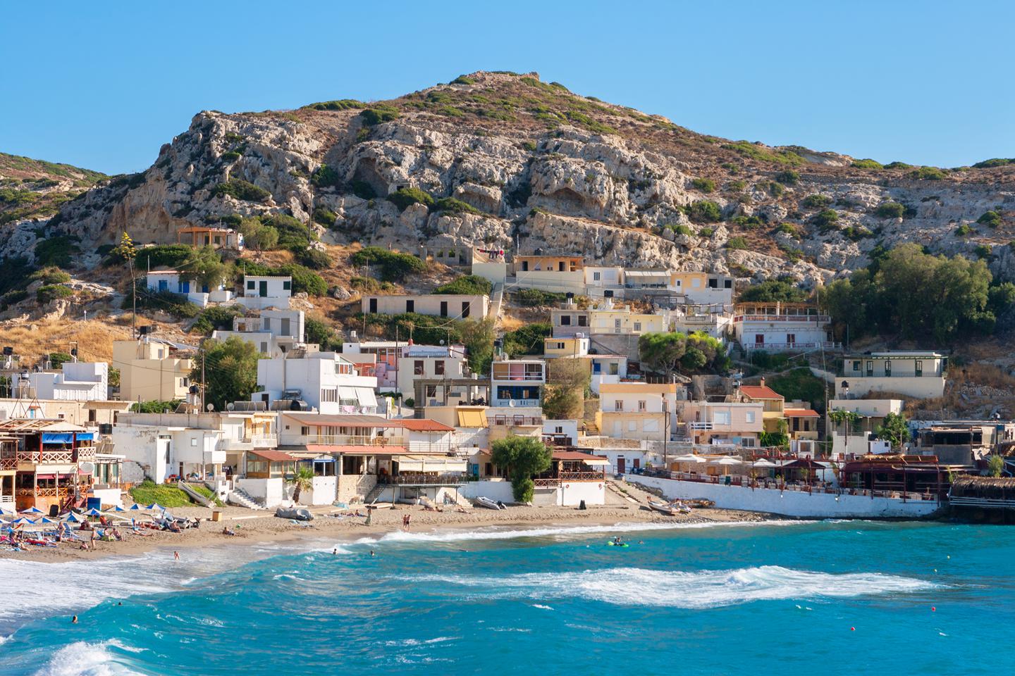 In de jaren ’60 was Matala het domein van de hippies en die Flower Power sfeer kun je soms nog steeds proeven. Maar de stad werd eerder al wereldberoemd vanwege de unieke ligging tussen de krijtrotsen, waarbij talrijke gaten voor een bijzonder beeld zorgen. Deze gaten werden ooit gebruikt als grafkamers.