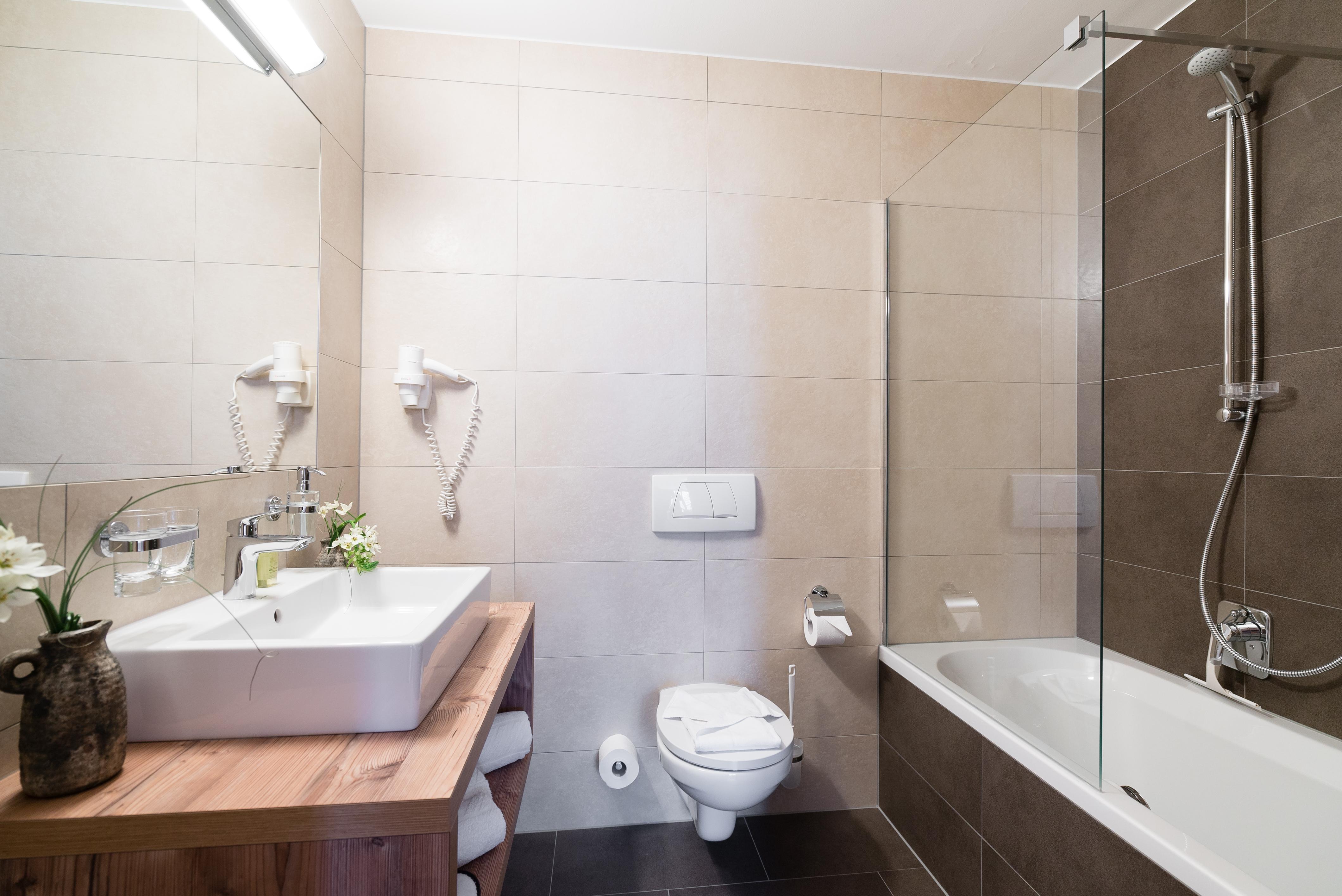- 1e badkamer met bad, toilet, föhn, make-upspiegel